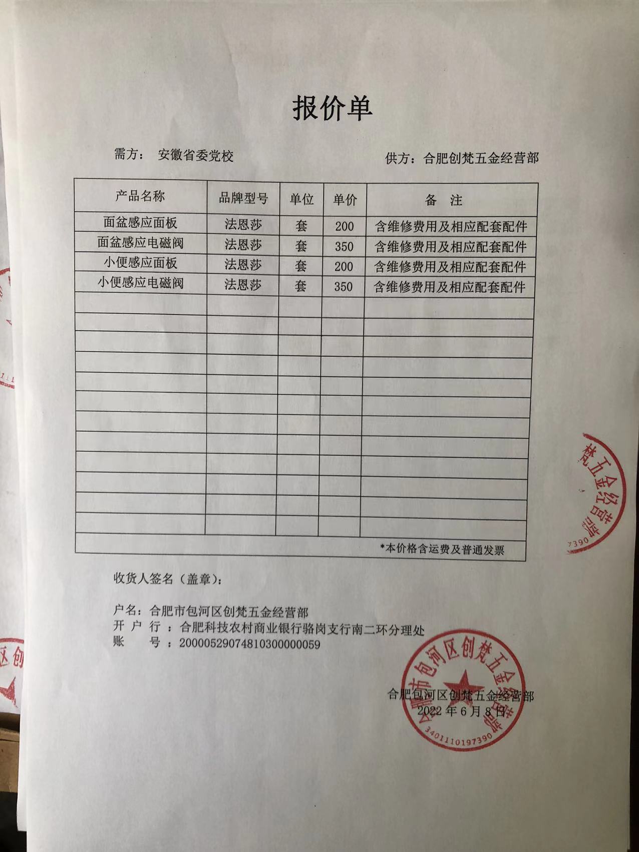 中共安徽省委黨校(安徽行政學(xué))潔具維修采購項目于2022年6月14日下午17:00開標(biāo)。中標(biāo)供應(yīng)商為合肥市包河區(qū)創(chuàng)梵五金經(jīng)營部,現(xiàn)予以公告,公告期為2022年6月15日至2022年6月17日。
