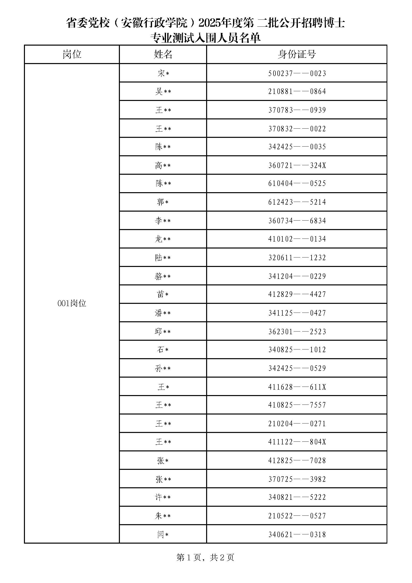 關(guān)于公布省委黨校(安徽行政學(xué)院)2025年度第二批公開招聘博士專業(yè)測試入圍人員名單的通知