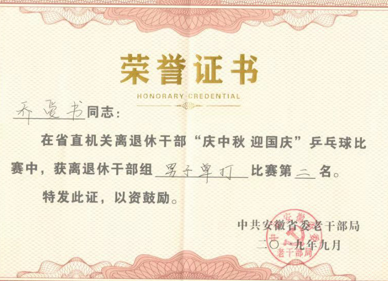 9月16日至20日,在省委老干部局舉辦的省直機(jī)關(guān)離退休干部“迎中秋 慶國(guó)慶”乒乓球比賽中,校(院)老同志喬愛(ài)書(shū)力克多名強(qiáng)手,獲得男子個(gè)人單打第二名好成績(jī)。