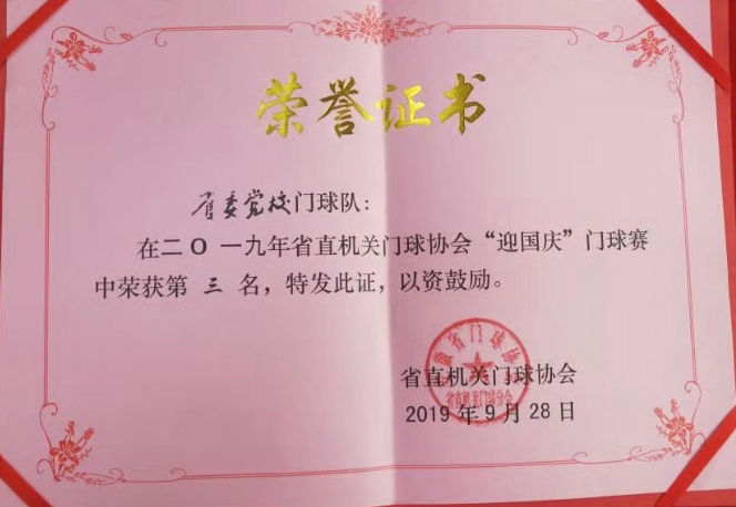 在2019年省直機(jī)關(guān)喜迎“國(guó)慶”七十周年門(mén)球比賽中,校(院)門(mén)球隊(duì)團(tuán)結(jié)協(xié)作,頑強(qiáng)拼博,充分發(fā)揮技戰(zhàn)術(shù)優(yōu)勢(shì),獲得第三名的優(yōu)異成績(jī)。