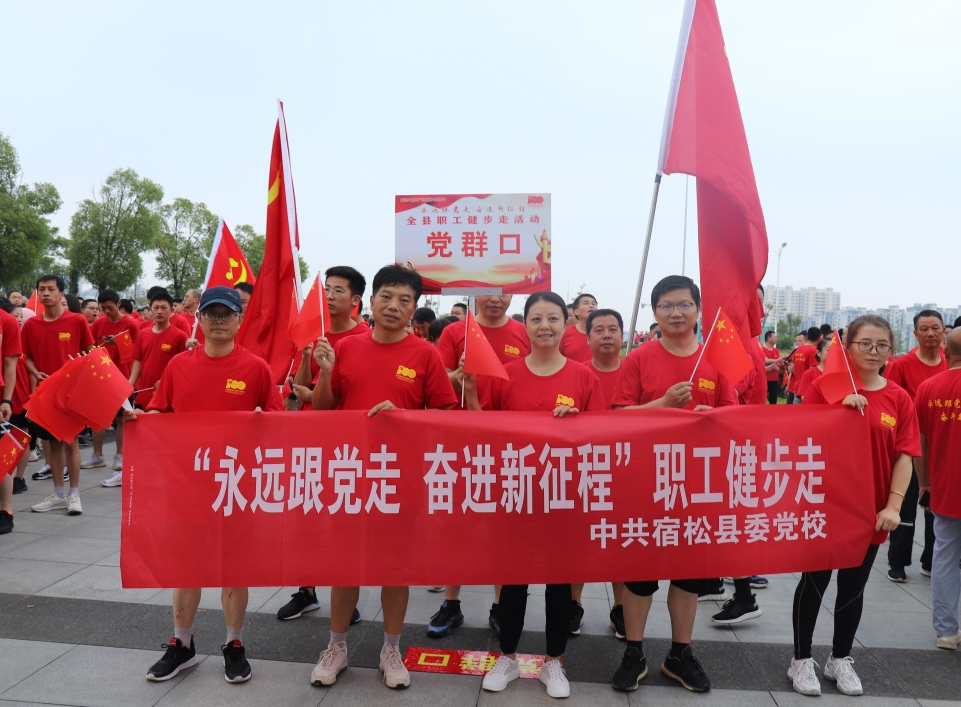 為深入學(xué)習(xí)宣傳貫徹習(xí)近平新時(shí)代中國特色社會主義思想,喜迎中國共產(chǎn)黨成立100周年, 6月29日清晨,中共宿松縣委黨校全體教職工身著印有“永遠(yuǎn)跟黨走 奮進(jìn)新征程”紅色T恤衫,手舉小紅旗,在縣委縣政府門前廣場黨群口隊(duì)伍集合,參加縣總工會組織開展的“永遠(yuǎn)跟黨走 奮進(jìn)新征程”全縣職工健步走活動。