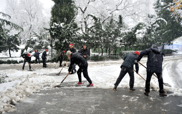 在黨校的北大門、在校園的主干道、在中心花園,隨處可見黨校教職工和學員除雪破冰的身影。大家有的鏟除道路上的冰雪,有的清除樹上的積雪,有的清理被雪壓斷的樹枝。志愿者們在寒風大雪中臉變得通紅,衣服、鞋子被雪水浸濕,但絲毫影響不了大家的干勁,盡力將道路和樹上的積雪清除干凈,將壓斷的樹枝運走。